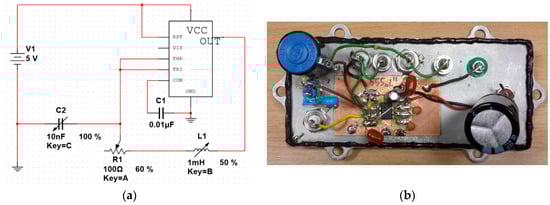 (a) Astable 555 circuit sensitive for impedance changes. Element L1 is the sensor’s impedance, connected in the feedback loop to the frequency range setting capacitor C2. This capacitor is chosen experimentally to obtain ~100 kHz transducer output for the given sensor. R1 is series variable resistance, which can be adjusted to tune the transducer characteristic—it is not needed for most applications. (b) Photo of prototype unit with additional input/output connectors and selectable range setting capacitors C2.