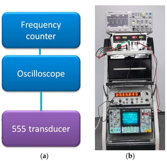 (a) Schematic diagram of mobile measurement test stand for a 555-based transducer, utilized for various sensors calibration; (b) photograph of actual test stand with power supply and additional digital oscilloscope.