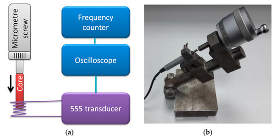 The sensor consisted of a coil and moving iron core, which allowed for an impedance change with the core’s displacement. The coil was connected as impedance in the 555 transducer circuit. Displacement was set with micrometer screw with 0.5 μm uncertainty.