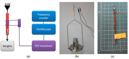 Due to the tensile stresses, the permeability of the steel core changes [,], which changes the coil impedance and in turn affects the 555 transducer output frequency. A similar sensor could be used in bending or torsional [] mode of operation, with significant sensitivity, but different characteristics. Amorphous [] or ferrite [] based magnetoelastic sensors are also suitable, the limiting condition being the needed driving current, which has to be supplied through the 555 IC.