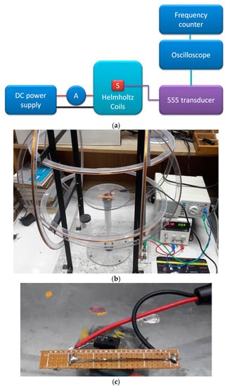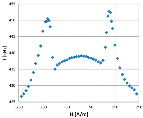 In this configuration, the 555 transducer was connected directly to ferromagnetic amorphous ribbon, 50 × 1 × 0.02 mm. The utilized material was a Co67Fe3Cr3B12Si15 high permeability alloy []. Due to the Giant Magneto Impedance effect, the ribbon impedance changes due to external magnetizing field H. The impedance change changes the transducer output frequency.