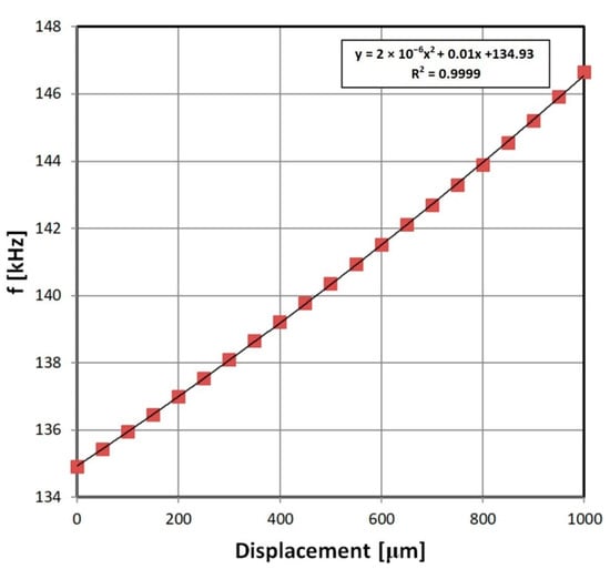 The inductive displacement sensor connected to 555 transducer proved to have near-linear characteristics (Figure 9). There was also no detectable hysteresis. The relative change of frequency is significant, and it shows that cheap micrometer sensors can be easily employed with presented approach. Depending on the sensor construction and frequency measurement method, 1 μm accuracy is achievable. For the presented exemplary sensor, and frequency measured with a frequency counter, the stable resolution was within 0.01% (0.1 μm) and the accuracy (mostly due to repeatability of the results) was 0.1% (1 μm). This is especially interesting given the transducer simplicity.
