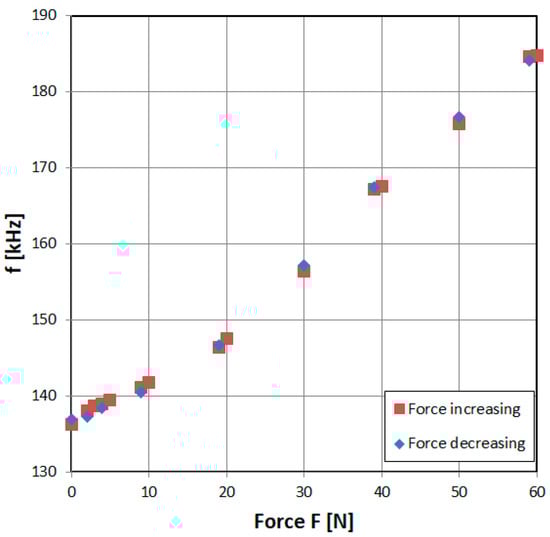 The characteristics of the simplistic magnetoelastic force sensor are presented in Figure 10. The obtained stable resolution was 0.02% (0.012 N). The accuracy of the sensor however is limited to ±1% (±5% in the low force region), mainly due to the sensor’s hysteresis, which is a major and unavoidable drawback of magnetoelastic technology []. The repeatability was therefore limited by the hysteresis to ±1–5%. There are some advanced approaches that can be used to minimize this error []. On the other hand, the magnetoelastic characteristic of constructional steel is proven to be stable and temperature insensitive [], which provides an extremely cheap (two pieces of wire + simple transducer) and robust tensile force sensor.