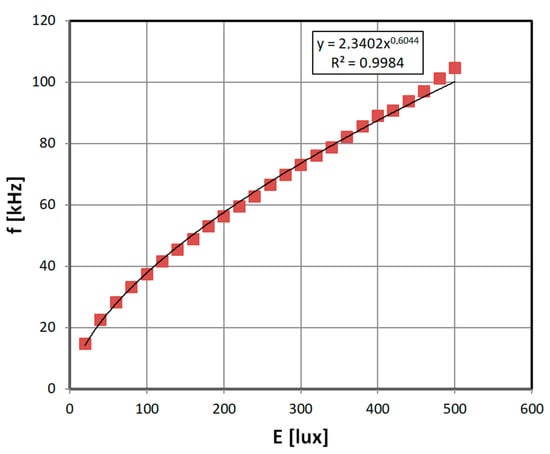 Lastly, the photoresistor characteristic is presented (Figure 13). The characteristic is monotonic, and allows for significant measurement resolution, outperforming typical voltage divider configuration. For the presented exemplary photoresistor, the stable resolution was 0.01% (0.05 lux), the repeatability was within 0.1%, and the accuracy was limited to 10% (50 lux), due to calibrating luxmeter accuracy.