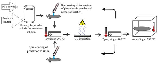 Each deposited layer then went through drying at 200 °C on a hot plate for 2 min, UV irradiation inside an exposure chamber under a 365 nm UV lamp for 10 min, and pyrolyzation at 400 °C for 2 min, successively. These procedures were repeated for the subsequent layers to reach the desired thickness. The rotational speed of the spin coater was adjusted at 1500 rpm, much less than that is usually used for thin and thick films. Higher speeds cause the piezoelectric powder to sprinkle out entirely and do not make a uniform layer. The UV irradiation allowed for a better rupture and ejection of the hydrocarbon chains of the ligands from the precursor films. A scheme for the consecutive steps of the hybrid sol-gel process is illustrated in Figure 1.