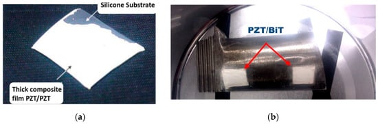Figure 2 shows two samples of composite PZT/PZT and PZT/BiT thick films deposited on the surface of a flat silicon wafer and a curved superalloy turbine blade using photochemical sol-gel technique. The results reveal that sol-gel deposition of the thick composite films lacks enough bonding to the substrate, durability, strength, smoothness, and resistance to cracking. To avoid the aforementioned shortcoming regarding the deposition of thick piezoelectric films using the sol-gel technique, the infiltration method was implemented. To apply the infiltration technique, the injection was modified such that the PZT or BiT precursor solution was initially dropped down as the first layer followed by the injection of the mixture of PZT/PZT or PZT/BiT suspension upon the surface of Si and Pt/Si flat wafers. These two steps, i.e., deposition of the precursor solution as the odd layers and powder suspension deposition as the even layers, were cyclically repeated for the subsequent layers.
