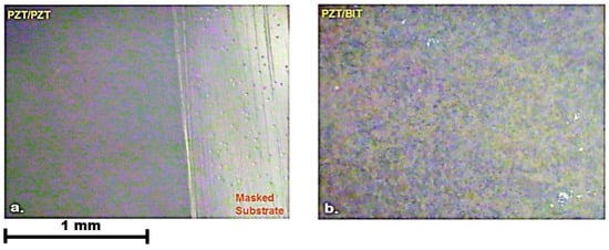 Optical microscopic images, composite films of (a) PZT/PZT on S5 and (b) PZT/BiT on L5.