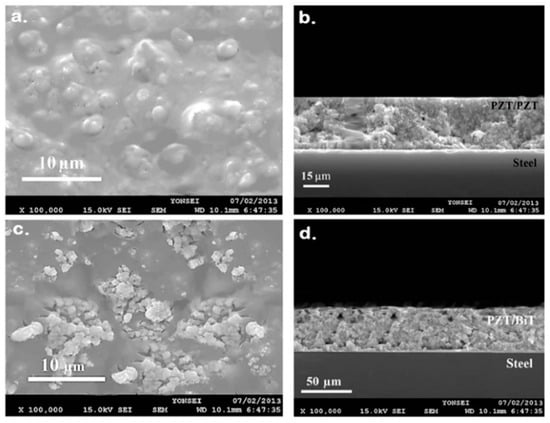 SEM images captured from hybrid thick films of type 5[C + 2S] (a,b) PZT/PZT of 30 μm thickness, and (c,d) PZT/BiT of 50 μm thickness.