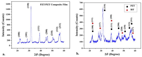 The X-ray diffraction (XRD) patterns obtained from multilayer PZT/PZT and PZT/BiT composite films are presented in Figure 6. The relatively higher intensity of PZT (110) is related to piezoelectric powder PZT-5A incorporated in the texture of the PZT/PZT and PZT/BiT films. The orientations of (100), (101), (111), (200), (210), (112), and (311) obtained for PZT in Figure 6a were also observed for the thick PZT films not mixed with powder in Reference [7]. In Figure 6b, black squares correspond to the PZT powder within the texture of sol-gel derived BiT crystals, which show the same planes as obtained for the sol-gel derived PZT crystals in Figure 6a. The planes (111), (117), (208), (220), and (317) indicated by red circles represent the sol-gel derived BiT crystals. The graph shows no impact of BiT on crystallization of PZT after annealing. XRD graphs indicate the formation of no secondary phases during multiple repetitive annealing procedures, which reflect the quality of the resultant crystalline structure in terms of purity, sensitivity, and stoichiometric combinations.
