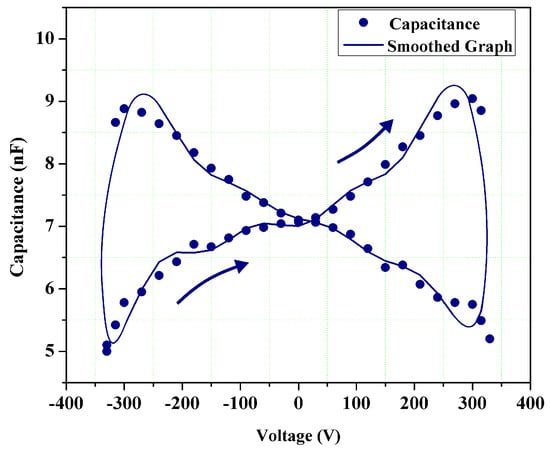 The capacitance-voltage (C-V) hysteresis loop of several composite samples was calculated using the famous Sawyer-Tower method and applying ±330 VDC at 100 kHz at the ambient temperature. Figure 7 demonstrates the results obtained from the 15 × 15 mm PZT/BiT, L1-B sample (at the center of the blade L1). The diagram shows a butterfly pattern with two peaks. Typically, dielectric materials do not show any change in the capacitance due to a change in the feed input voltage, as the capacitance is a function of geometrical parameters (thickness and surface area). In piezoelectric materials changing the bias and fluctuating voltages cause a change in electrical impedance, sensor volume and consequently the capacitance.