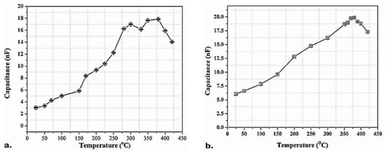 Capacitance-temperature (C-T) variations for the PZT/BiT films at 25–420 °C, (a) L1-A and (b) L1-B.