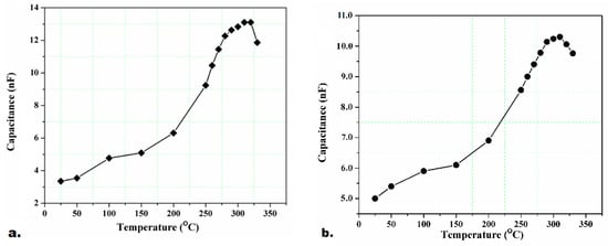 The C-T variations for the PZT/PZT films at 25–330 °C, (a) L3-A and (b) L3-B.