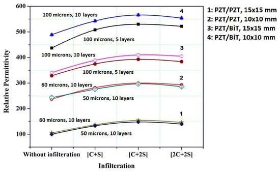 According to the acquired results shown in Figure 10, there is a rise in dielectric permittivity (εr) as the number of layers, and the infiltration steps increase; nevertheless, the dielectric loss (tanδ) remains almost constant. It might happen due to a mitigation in material porosity and improvement in the bonding of piezoelectric powder particles with the sol-gel matrix. Concerning the dielectric permittivity of the samples, porosity acts like series or parallel capacitors in conjunction with the adjacent dense piezoelectric columns. As the volumetric ratio of porous cavities (filled with air) to the piezoelectric film increases, the tendency of the air dielectric permittivity to be placed in serial, versus parallel, with that of the composite film increases. In other words, the volume of porous cavities adversely affects the relative dielectric constant.