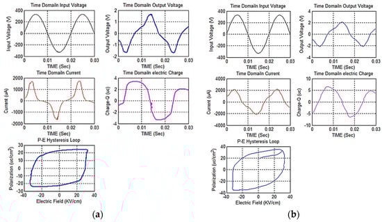 The remnant polarization (P at electric field = 0), similar to the dielectric permittivity, is raised by increasing the number of sol-gel infiltration through the composite layers. The films of larger dimensions have more desirable conditions in terms of internal tension and uniform heat absorption. Hence, their remnant polarization is a little higher. The results indicate a higher remnant polarization in L-PZT/BiT films compared with the L-PZT/PZT samples. The reason could be attributed to several factors including, better penetration of BiT solution compared to PZT through the composite layers of the thick films, the relative decline in the porosity, higher viscosity of BiT solution that facilitates the deposition of thicker films up to 100 microns in this research. The thicker the films, the greater number of grains will be formed in the microstructure, and the remnant polarization will increase, proportionally. The ferroelectric (P-E) hysteresis loops of two samples are displayed in Figure 11. This figure also represents the input (feed) and the amplified output (measured) voltage signals on the oscilloscope during the P-E hysteresis loop measurement at 50 Hz. Equation 1 shows how the polarization (P) is derived from current (I), electric displacement (D), electric charge (Q = I/t), time (t), cross-section (A), and electric field (E). The MATLAB coding program for calculation of the P-E hysteresis loop is presented in Appendix A, which is based on the standard IEEE180, National Physics Laboratory, UK [40].