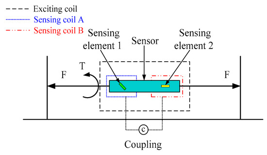 The working principle of the force sensor is based on the inverse magnetostrictive effect, which measures stress by detecting a change in the magnetic permeability, caused by the mechanical load, in a wireless and passive manner. The sensing material is Fe40Ni38Mo4B18 (model 2826 MB, Metglas Inc., Hong Kong, China), which is a ribbon-like amorphous ferromagnetic alloy. The biocompatible application of the magnetostrictive material has existed for many years [,,,]. The Fe40Ni38Mo4B18 alloy not only exhibits a high permeability, low resistivity, high magnetostriction coefficient, and high mechanical tensile strength, but has a low material cost, which allows for it to be used on a disposable basis [,,]. In addition, the material has a high magnetoelastic coupling coefficient, as high as 0.98, and a magnetostriction to the order of 10−5, which allows for efficient conversion between magnetic and elastic energies, and vice versa [,]. The operating principle representation is shown in Figure 1. The sensor is in the magnetic field, which is generated by an exciting coil. When the sensor is subjected to tension or torque strain, the permeability of the Fe40Ni38Mo4B18 alloy will change accordingly with the force. At the same time, the permeability variation leads to the change of magnetic flux density, which is obtained by sensing coils A and B, respectively.