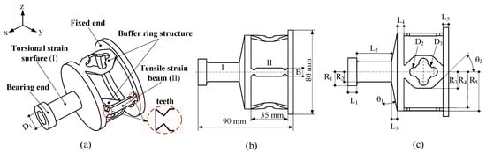 The tensile strain beam is a strip-type, with a symmetrical teeth distribution at both ends. The torsional strain surface is a central symmetric hollow cylindrical thin-walled structure. The tensile strain beams and torsional strain surface are bonded with sensing materials in order to detect the stress caused by tension and torque, respectively. The fixed end and bearing end are used for the sensor’s installation, fixation, and loading application, respectively. The buffer ring structure is a thin-walled structure formed by arranging some holes through the surface of the polygon. The principle of the structure decoupling method is based on the stiffness distribution. Through the design of the smart structure, the torque- and tension-sensitive regions are distributed more reasonably under the action of the buffer transition. Figure 2 and Table 1 both show the specific structure dimensions of the sensor.