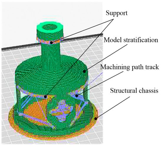 If this structure adopts the form of a split combination, there will be some problems in the design and manufacture of the mechanical structure, such as the matching clearance and dead zone. Therefore, an elastic integrated structure is adopted; however, the overall manufacture difficulty is greatly increased. This integral hollow thin-walled structure is difficult to achieve using the traditional mechanical processing method. Our design benefits from 3D printing technology, which is different from the traditional processing technology of removing the material. The three-dimensional entity is generated by adding the material layer-by-layer. Figure 3 is the stratification of the structure before 3D printing. According to the requirements of precision, as well as other relevant parameters, the model is cut in a parallel plane along the forming direction of the part. The orange bottom is the structure chassis for the entire 3D printing, the green part is the stratification effect of the three-dimensional entity, and the intersection of the purple and yellow lines represents the support and path in the stacking process. Finally, the model will be imported into the 3D printer, and the machining path will be formed according to the stratification. The entity model will be processed and accumulated layer-by-layer until the model is completed. All parts of the sensor, except for the sensing elements, are manufactured by the MakerBot Replicator Z183D (LLC One Metro Tech Center, Brooklyn, NY, USA) printer. The material of the elastomer structure is polylactic acid (PLA), which is a biocompatible [,,] thermosensitive plastic extracted from corn starch.