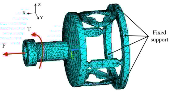 In order to obtain the optimal strain-sensitive regions of the tension and torque of the sensor, the finite element method (FEM) is used in this paper to accomplish the design and analysis. According to the structural parameters of the sensor listed in Table 1, the finite element (FE) model of the sensor is created, and the SOLID187 element is adopted for meshing using the ANSYS software. Table 2 shows the number of elements and nodes used in the FE model. The material properties used for the sensor structure are listed in Table 2. FEM is used for analyzing the strain-sensitive regions when the sensor is under load. In order to analyze the strain of the sensor under external loads, the loads and constraint conditions are set in the established model. The results of the model meshing and force constraint conditions are shown in Figure 4.