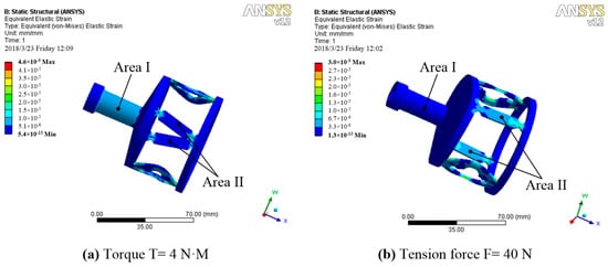 The static structure simulation of the 3D elastomer structure model is accomplished using ANSYS. The corresponding tensile-sensitive region and the torque-sensitive region are obtained using an FEM analysis. The results of the analysis are shown in Figure 5a,b. When the elastomer structure is subjected to the torque of T = 4 N·M alone, the whole structure is subjected to torsional shear stress. The torsional area I can withstand remarkable strain. The buffer ring bears most of the torque effect. Only a small shear force acts on the tensile area II, and the shear effect is concentrated at the two ends of the tensile beam. The main part of the tensile beam bears very little torque strain. Finally, the strain in torsional region I, due to the torque, is higher than that of region II. When the elastomer structure is subjected to the tension force of F = 40 N alone, the torsional strain surface can transfer most of the tension force to the tensile strain beam in the case of very small strain, owing to its high tensile stiffness. The tensile strain beam has an obvious strain because of its tension sensitiveness. Therefore, the strain sensitivity of strain region II to the tensile force is much greater than that of region I.