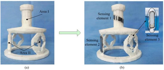The elastomer structure of the two-dimensional sensor proposed in this paper is based on the stiffness distribution. Through the reasonable distribution of stiffness from the sensor structure, the sensitive areas under tension and torque effects are at different positions, which can reduce the dimensional coupling to the largest extent. Finally, according to the results of the strain analysis and the mechanical characteristics of the materials, three pieces of the ribbon-like magnetostrictive sensing elements are stuck on the surface of the elastomer structure, as shown in Figure 6. The sensing elements of the sensor in this study have a size of 25 mm × 7 mm × 28 μm (length × width × thickness). The magnetostrictive sensing element of torque-sensitive region I is arranged at an angle of 45° to the central axis. The magnetostrictive sensing elements of tensile-sensitive region II are two parallel, diametrically opposite pieces. A high viscosity adhesive is selected for the sensor, so as to guarantee a rigid state. A high stiffness adhesive, J-B WeldTM (Northeast Texas, TX, USA), is adopted in the process of the sensor’s fabrication [].