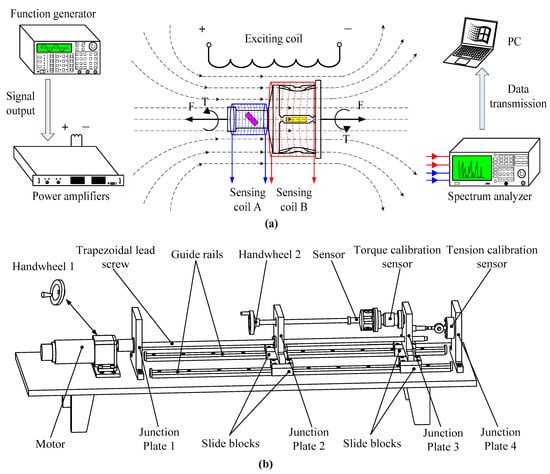 Figure 7a shows a sketch diagram of the experiment setup for the output performance measurement. The stress of the sensor could be detected via the sensing coils. In order to analyze the tension and torque variations of the sensor, the experiment devices need to be equipped with accurate tension and torque sensors, as well as digital display instruments. Hence, a two-dimensional loading platform is developed in this paper. The two-dimensional loading platform consists of guide rails, sliding blocks, a trapezoidal lead screw, junction plates, handwheels, and display instruments, which are used for calibrating the tension and torque sensors. As shown in Figure 7b, the two-dimensional sensor is installed on the testing platform for force loading. The loading platform is placed on the guide rails, with high-linear precision. This not only reduces the frictional resistance while applying as much force as possible, but it also ensures the high accuracy of the experiment. The sensor is fixed between two junction plates using a bolted connection. The junction plates are fixed on the sliding blocks, which can move along the parallel guide rails. The platform could apply tension and torque to the sensor through two handwheels connected to the left end.