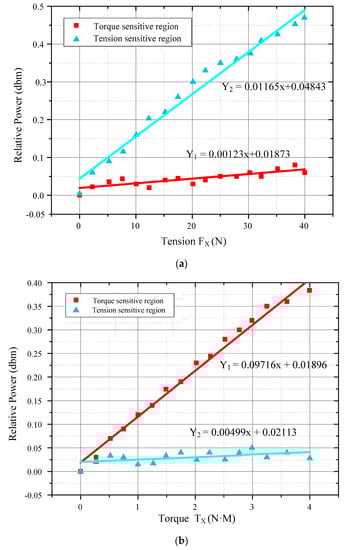 Figure 9a,b shows the relationships between the external force and the relative power of the detected third-order harmonic signals. In Figure 9a, a separate tension force Fx was applied to the sensor through the platform. Responses to the force Fx arose in the torque sensitive region I and force sensitive region II at the same time. With the Fx increasing, the response increased also. The relationship between the force Fx and the response in force-sensitive region II was almost a linear one. The linear fitting result was Y2 = 0.01165x + 0.04843 and the slope was 0.01165. In the torque-sensitive region I, a response to the force Fx also existed, but the varying tendency was much more different. Under the same external force Fx, only a very small output was detected by the sensing coil A. The linear fitting result was Y1 = 0.00123x + 0.01873 and the slope was 0.00123. The two different slopes indicated that the force-sensing region was much more sensitive than the torque-sensing region to the external tension force. In Figure 9b, the same situation happened when applying a separate torque Tx. A much larger increase was detected in the torque-sensitive region than in the force-sensitive region. The relationship between the torque input and response of the sensor is Y1 = 0.09716x + 0.01896 in the torque-sensitive region and Y2 = 0.00499x + 0.02113 in the tension-sensitive region. Finally, the measurement range of the tension and torque was 0–40 N and 0–4 N·M, respectively. After that, the output of the sensing coils did not change with the external force, as the magnetostriction materials gradually became saturated (the saturation magnetostriction of the sensor was 12 ppm from the datasheet of Metglas Inc., Conway, SC, USA).