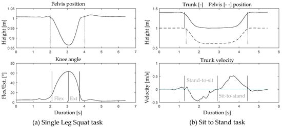 (a). Definition of the flexion and extension movement phase during the single leg squat (SLS) using the pelvis position and knee flexion/extension angle; (b) definition of the stand-to-sit and sit-to-stand (STS) phase, using the trunk and pelvis position and the trunk velocity.