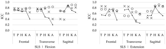 Within-session (▪), between-session (×), and between-operator (ο) intraclass correlations (ICCs) of the trunk (T), pelvis (P), hip (H), knee (K), and ankle (A) range of motion (ROM) of all rotations, in the flexion phase (left) and the extension phase (right) during the single leg squat (SLS) task.