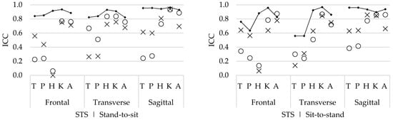 Within-session (▪), between-session (×), and between-operator (ο) intraclass correlations (ICCs) of the trunk (T), pelvis (P), hip (H), knee (K), and ankle (A) range of motion (ROM) of all rotations, in the stand-to-sit (left) and the sit-to-stand phase (right) during the sit to stand (STS) task.