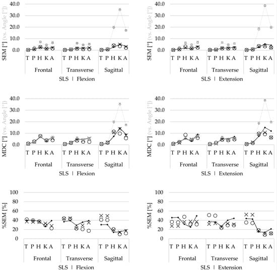 Within-session (▪), between-session (×), and between-operator (ο) standard errors of measurement (SEM), minimum detectable change (MDC), and proportional SEM (%SEM) of the trunk (T), pelvis (P), hip (H), knee (K), and ankle (A) range of motion (ROM) of all rotations, in the flexion phase (left) and the extension (right) phase, during the single leg squat (SLS) task. The grey in the mean ROM of all joints indicates the (proportional) difference with the SEM and MDC.