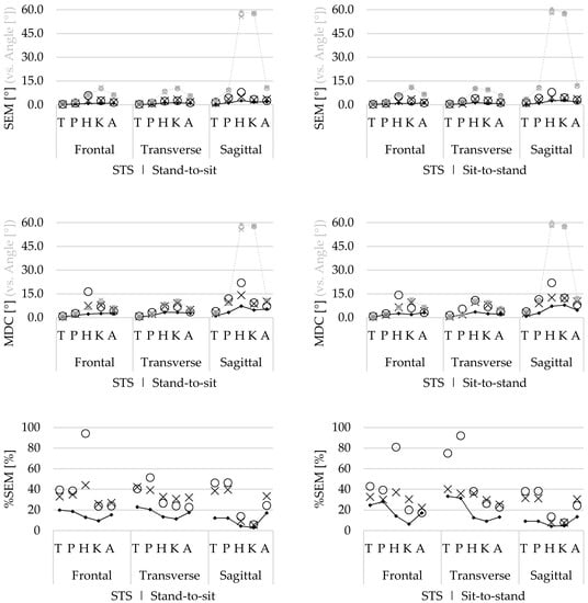 Within-session (▪), between-session (×), and between-operator (ο) standard errors of measurement (SEM), minimum detectable change (MDC), and proportional SEM (%SEM) of the trunk (T), pelvis (P), hip (H), knee (K), and ankle (A) range of motion (ROM) of all rotations, in the stand-to-sit (left) and the sit-to-stand phase (right), during the sit to stand (STS) task. The grey in the mean ROM of all joints indicates the (proportional) difference with the SEM and MDC.