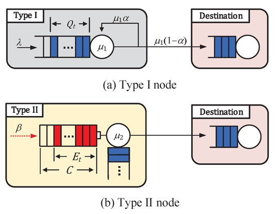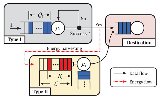 We consider a wireless network comprising two types of nodes, a Type I node and a Type II node, as shown in Figure 1. A slotted-Aloha multiple access channel is considered. A single wireless channel is time-slotted, and the two nodes are time-synchronized as assumed in [10,11,12,14,29] so that the slot duration is equal to the transmission time of one data packet. For each type of node, the following assumptions are made.