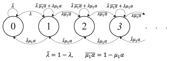 - We first analyze the data queueing process of the Type I node under the assumption that the energy queueing process of the Type II node is in a steady state (see Figure 2a). In order to consider the interaction between the data and energy queueing processes, we introduce the following probability:In what follows, we denote for . The probability is the steady-state probability that the Type II node makes a transmission attempt in a slot, which can be written as follows:In the original model, the data packet departure process of the Type I node is influenced by both the energy queue status and the action of the Type II node. However, in the modified system, the two stochastic processes and are loosely coupled via the parameter .