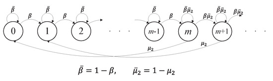 Suppose that the energy queueing process of the Type II node is in a steady state. The one-step transition probabilities of are given as follows (see Figure 3).
