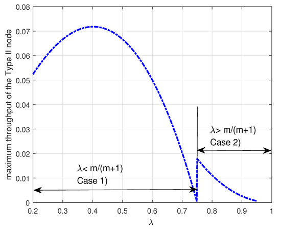 Maximum throughput of the Type II node for Case (1) and Case (2) when . In this figure, Case (1) represents the maximum throughput of the Type II node given by the Theorem 2 and Case (2) represents the maximum throughput of the Type II node given by the Theorem 3.
