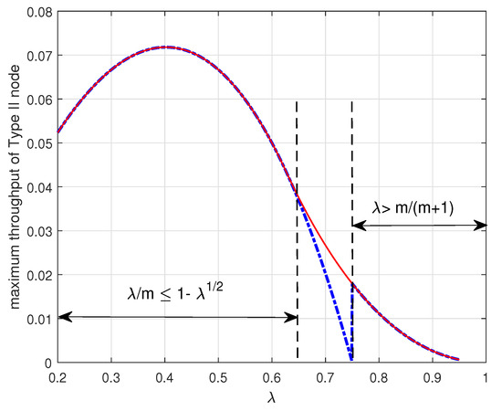 - The system throughput is insensitive to the transmission probabilities and if and . Thus, for a given arrival rate λ, the maximum system throughput is the same regardless of and . This implies that choosing is most desirable from the perspective of packet delay of the Type I node, as will be discussed in the next section.