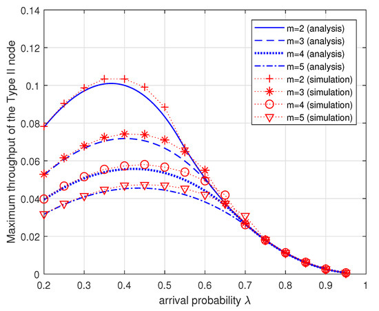 In Figure 7, the maximum throughput of the Type II node is plotted for the varying arrival probability when For each , the maximum throughput of the Type II node is given by the Corollary 1. Note that the throughput of Type I node is always equal to the arrival probability as long as the data queue is stable. Simulation results are also plotted to validate the accuracy of our proposed analytical model. Simulations are performed using the Matlab software. Each simulation result shown in the figures is a result of performing for one million slots including an initial warm-up time of 0.3 million slots. Figure 7 shows that for each m the maximum throughput of the Type II node is dependent on the arrival probability and there exists an optimal which maximizes the throughput of the Type II node. We also see that as m increases the maximum throughput of the Type II node decreases as expected because more energy is necessary for a data packet transmission. We notice that when the arrival probability is relatively large, that is, the Type II node is in the energy-unlimited phase, the maximum throughput is almost same regardless of m. The analytical results and the simulation results agree within a reasonable accuracy.