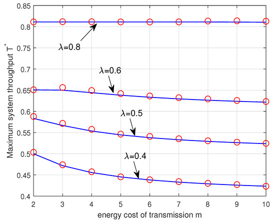 Maximum system throughput (given by the Corollary 1) versus the energy cost of transmission m for different . The analytical results and the simulation results are plotted in solid lines and ‘∘’ markers, respectively.