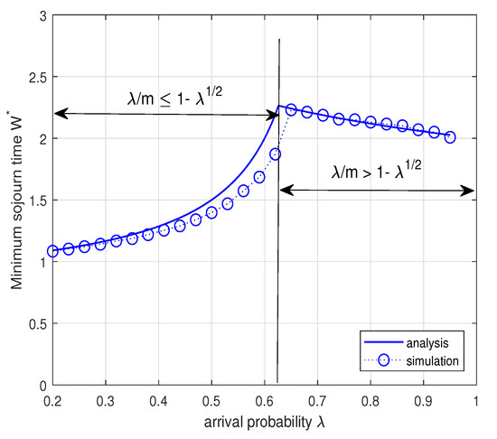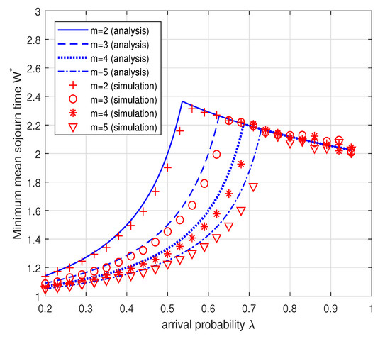 In the above Corollary, we note that the minimum mean sojourn time increases as increases to and then decreases as increases from to 1. The decrease in the mean sojourn time when the arrival rate increases seems to be against our intuition. This result can be interpreted as follows: (1) when , the Type II node operates in the energy-limited phase with a relatively large transmission probability for stabilizing its energy queue and thus the sojourn time of a data packet for the Type I node is likely to increase due to collisions with the Type II node; (2) when , the Type II node should maintain a small transmission probability for stabilizing the data queue of the Type II node and thus the possibility of collision decreases, which results in smaller mean sojourn time. This interpretation is confirmed by Figure 9. Figure 9 plots the minimum mean sojourn time versus the arrival probability when . As explained above, the minimum sojourn time increases as the arrival probability increases to and then decreases with the increase of . Figure 10 shows the minimum mean sojourn time versus the arrival probability for different It is worth noting that the minimum mean sojourn time decreases as m increases when the Type II node is in the energy-limited phase. This is expected because the larger the energy cost of transmission m, the more energy is necessary for a data packet transmission, thus the possibility for the Type II node to transmit is likely to decrease and this in turn reduces the possibility of collision, which results in small mean sojourn time. We again see that in Figure 9 and Figure 10 the analytical results match well with the simulation results within reasonable accuracy.