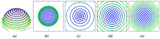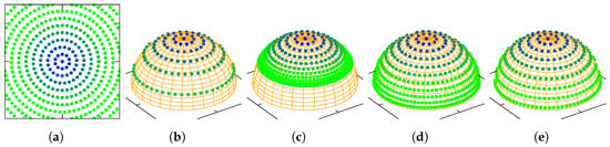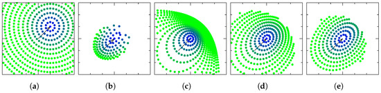 Figure 1 shows how points in the sphere (subspace of the sphere where quaternions live) are mapped to points in (subspace of where the images of the charts are contained) through each one of the named charts. Since our charts are homeomorphisms, it is possible to invert the functions. Figure 2 shows how points from are mapped to points in the manifold through the inverted charts. As pointed in Reference [8], all four charts provide the same second-order approximation for a point near the origin, to a quaternion