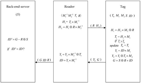 RFID systems usually consist of three parts: Tag, Reader, and Back-end server. RFID tags are wireless transceivers equipped on objects for detection. Each tag has a certain amount of computing and storage capacity. RFID readers are wireless transceivers that transmit electromagnetic waves through radio frequency antennas to interact with tags. The reader communicates with the label through radio frequency and transfers data to the background server, realizing the information exchange between the background server and label. Back-end server usually refers to a database system with strong data processing capability and storage capacity, which stores and manages the data related to tags. It can judge and verify the information from the tags []. The authentication cost also needs to be taken into account for the practical application []. One of the most important factors is tag’s computing overhead, which is often measured by the number of logic gates. Tags have very limited resources, about 5000 to 10,000 logic gates in total, of which only 2000 to 3000 logic gates can be used for encryption and authentication. In addition, the resource-constrained tags can only store a few hundred bits of data. The cost of low-cost tags mainly depends on the encryption and authentication method of the protocol [].