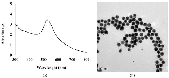 In addition, 1 mL of 1% (w/w) aqueous solution of trisodium citrate was prepared and added to the first beaker under vigorous stirring. The color of the gold chloride solution turned from pale yellow to wine-red 60 s after heating was stopped, indicating the formation of a gold cluster. The mixture vessel was then allowed to cool to room temperature. The final stabilized AuNPs were characterized by UV-vis spectrometry and the results are presented in Figure 1a. The absorption peak found at around 527 nm is attributed to the characteristic plasmon band of the AuNPs.