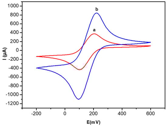 Cyclic voltammetry (CV) curves of the PEC/GOD modified gold electrode in the absence (a) and the presence of AuNPs (b). Measurements in 10 mM [Fe[(CN)6]3−/4− PBS solution (0.1 M, pH 7.4) and scan rate 100 mV/s.