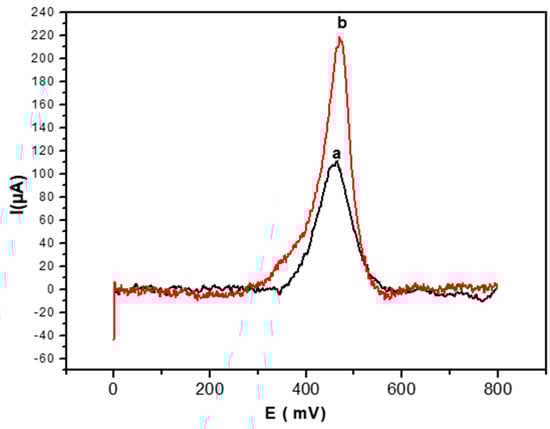 Square wave voltammetry (SWV) anodic peak for glucose detection (0.2 mM) obtained with the PEC/GOD modified gold electrode in the absence (a) and the presence (b) of AuNPs. SWV performed at 100 mV/s in PBS solution (0.1 M, pH 7.4).