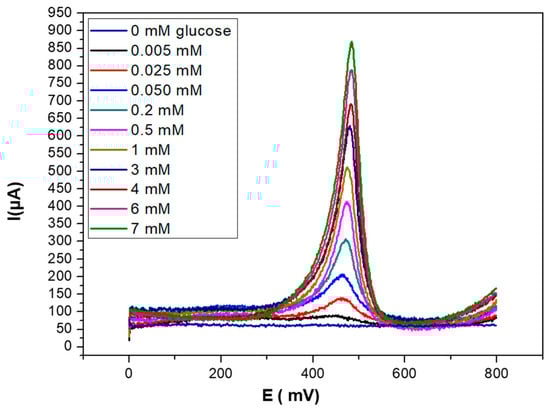 As shown in Figure 8, the maximum SWV response for 7 mM of glucose, obtained with a PEC/AuNPs/GOD modified electrode, is 791 µA, compared to 261 μA for the PEC/GOD modified one []. The presence of these gold nanoparticles improves the performance of the glucose sensor based on PEC/GOD, due to the electrocatalytic properties of AuNPs.