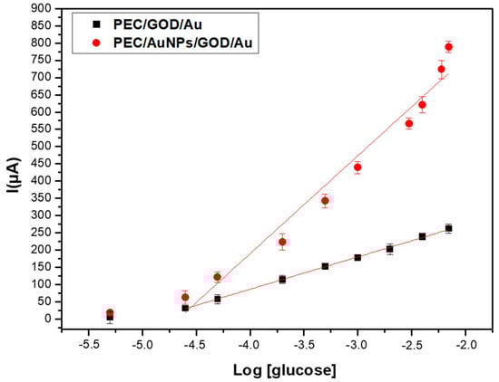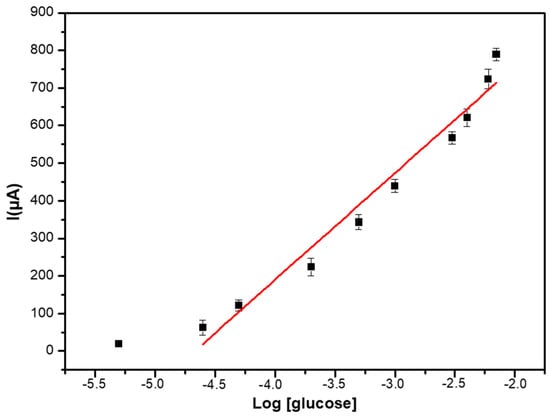 The electroanalytical characterization of glucose biosensors was performed by using SWV as the detection technique, recording the current intensity at the PEC/AuNPs/GOD/Au modified electrode at different concentrations of glucose after 5 min of contact. This time was sufficient to achieve a stable signal for each injected concentration. As seen in Figure 6, the biosensor signal increased with glucose concentration in the 0–7 mM range. The sensitivity of the technique, corresponding to the slope of the linear part of the curve, was 283.9 µA/log[glucose].