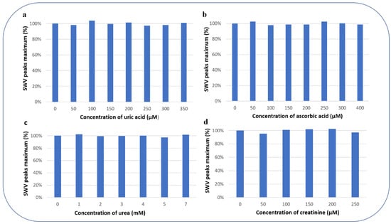 SWV peak maximum (%) for the detection of 0.2 mM glucose concentration in presence of different concentrations of possibly interfering substances (a) uric acid, (b) ascorbic acid, (c) urea, and (d) creatinine.