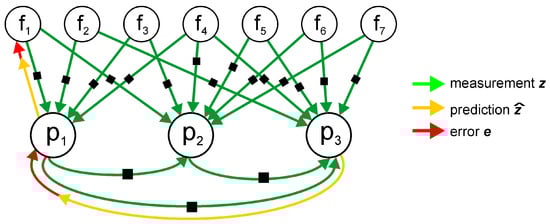 where assuming the total number of M measurements, yields the m-th predicted measurement/observation applying the sensor model. Defining the difference between the m-th observation and its prediction as the error function: