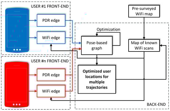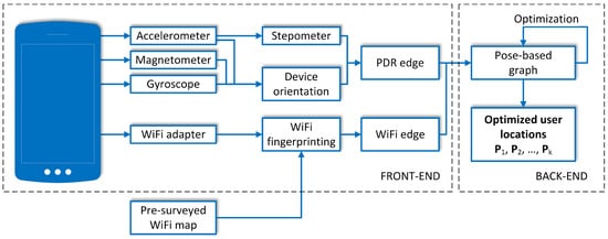 An overview of the processing blocks in the single-user version of the proposed positioning system is presented in Figure 2. The front-end is composed of blocks that process data from the sensors available in a mobile device to implement the PDR for user motion estimation, and WiFi-based localization employing WKNN. The measurements processed by these blocks are then represented as edges in the go-based back-end that provides the best pose guess after the optimization procedure. In this version the whole system is self-contained and can be implemented on a smartphone, running in real-time, as demonstrated in Ref. []. The following subsections present the used components in more details.