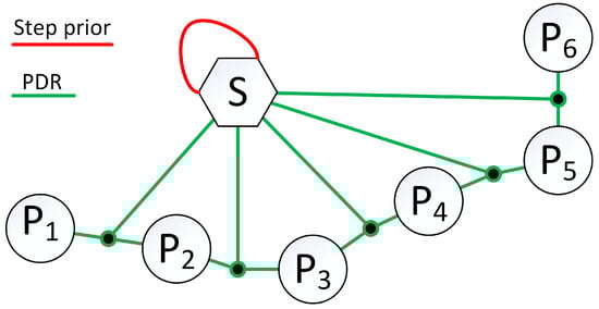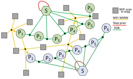 where are coordinates of the i-th user pose, is the estimated step length, is the measured dominant frequency of walking, and is the measured change in the heading angle. The exemplary graph with PDR edges is presented in Figure 3.